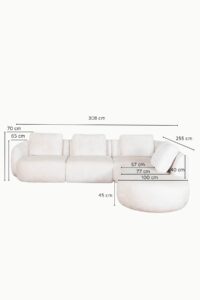 Le canapé d’angle modulable Dallas séduit par ses lignes généreuses et son design contemporain. Revêtu d’un tissu bouclé fin, au relief subtil et élégant, il apporte une touche chaleureuse et raffinée à tout salon design. Son format d’angle est idéal pour créer un espace convivial, tandis que ses dimensions de 308x255xP.100 cm assurent une présence équilibrée dans la pièce. Son esthétique intemporelle s’intègre parfaitement à une décoration épurée ou minimaliste.
