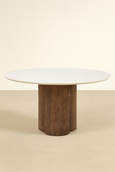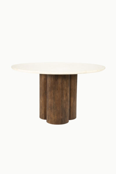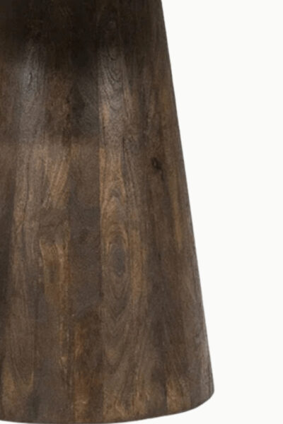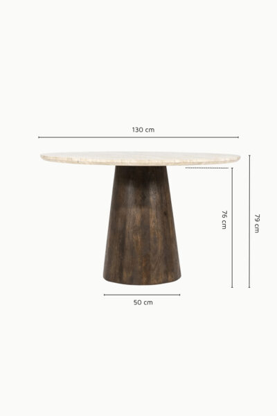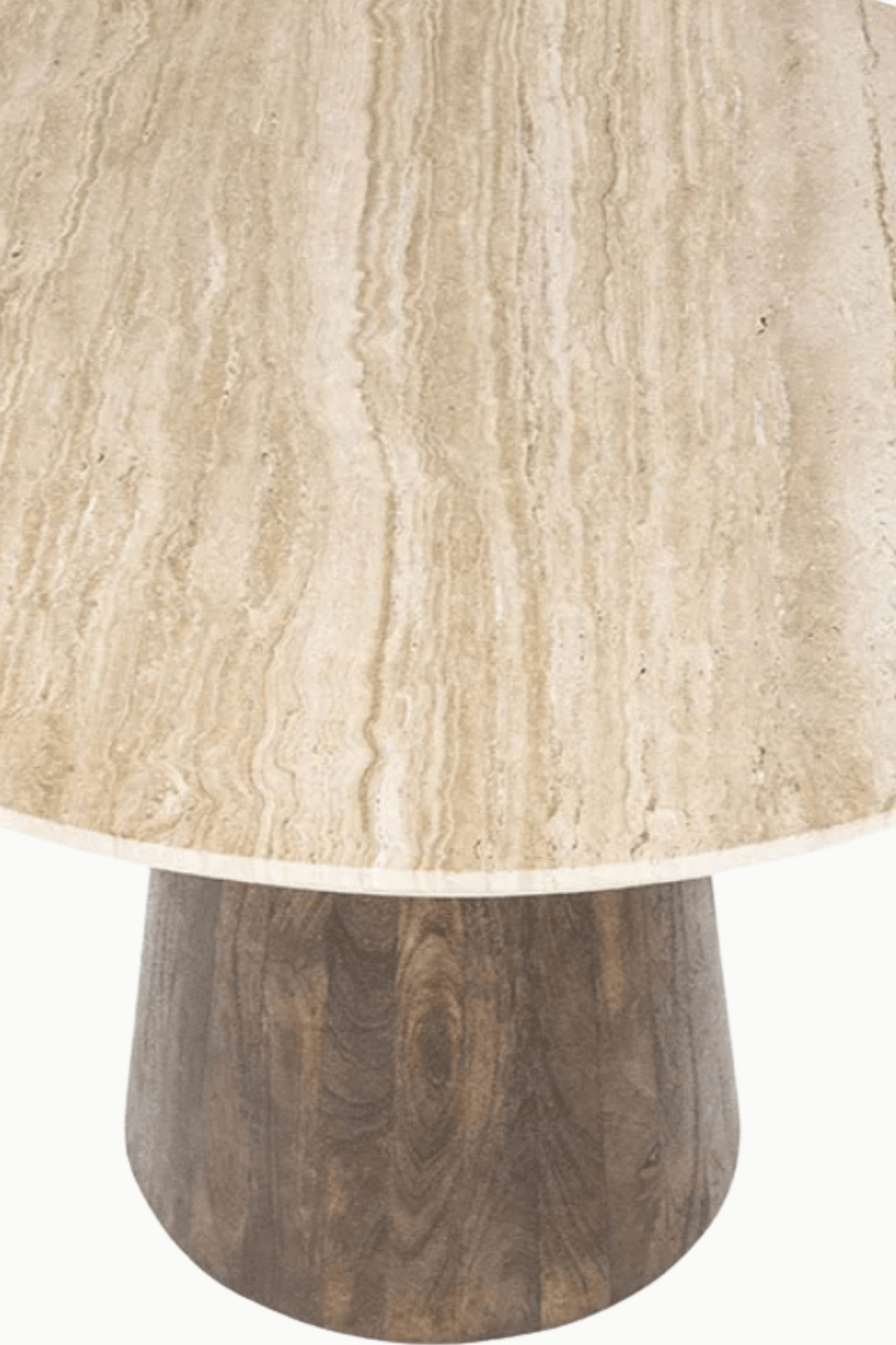 Le travertin, pierre naturelle prisée pour ses nuances beiges et ses motifs irréguliers, offre à cette table une élégance minérale. Sa surface est polie pour un toucher doux et une résistance optimale. Le piètement conique en bois de manguier assure stabilité et équilibre, tout en réchauffant l’esthétique globale. Chaque modèle est unique, et c’est ce qui en fait toute sa richesse.