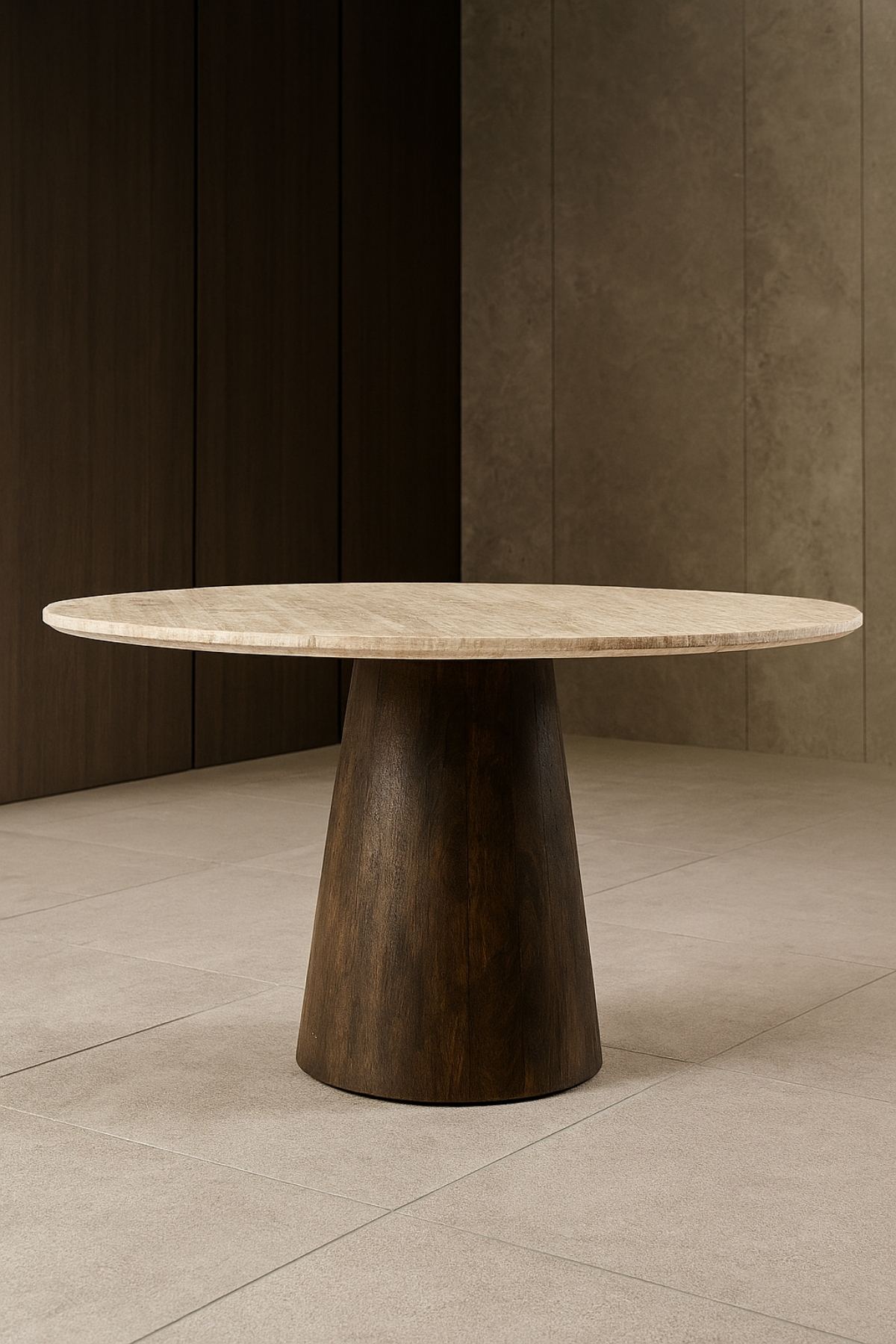 Table à manger TEKIN : le raffinement du travertin, la chaleur du bois