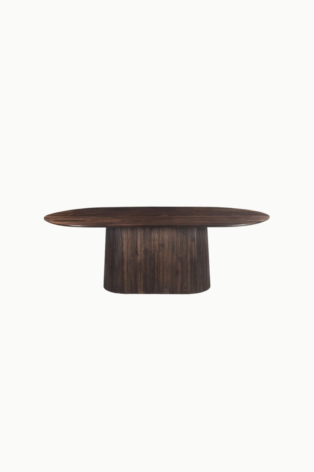 Entièrement conçue en bois de manguier, la table gina repose sur un piètement central cannelé au dessin vertical affirmé, visible sur la photo. Ce socle plein confère à la table une excellente stabilité tout en renforçant son caractère architectural. Le plateau ovale, aux lignes nettes et équilibrées, met en valeur le veinage naturel du bois et sa teinte profonde. L’ensemble crée une esthétique sobre et sophistiquée, parfaitement en phase avec les intérieurs contemporains, minimalistes ou d’inspiration japandi.